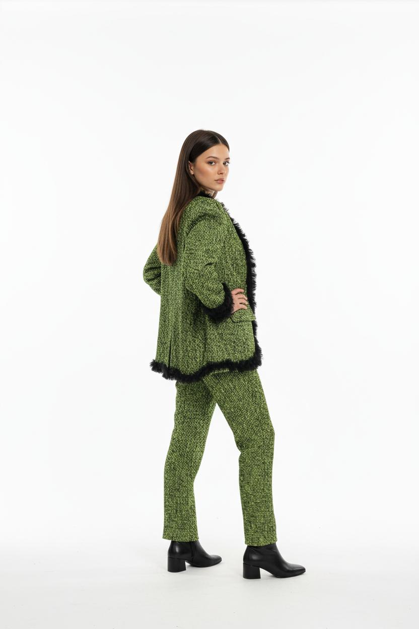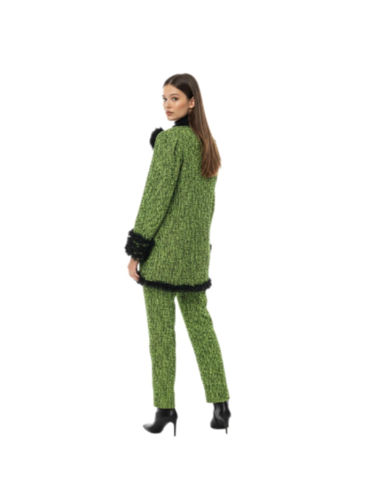 The Moss Jacquard Trim Set is a tailored two-piece ensemble defined by texture, contrast, and refined structure. Crafted in a richly woven jacquard fabric, the set features a structured jacket accented with plush trim detailing along the cuffs and edges, paired with a clean, elongated trouser silhouette.